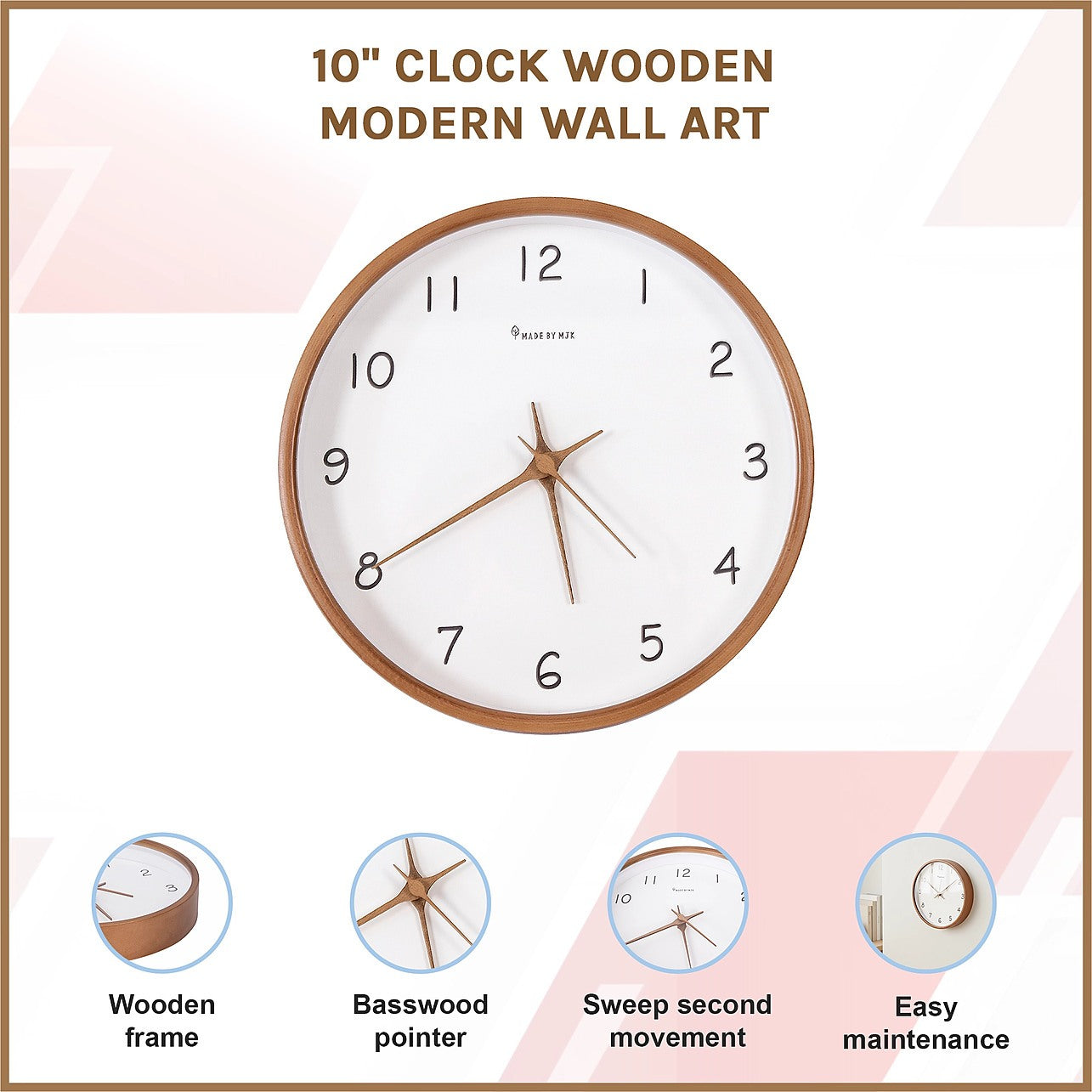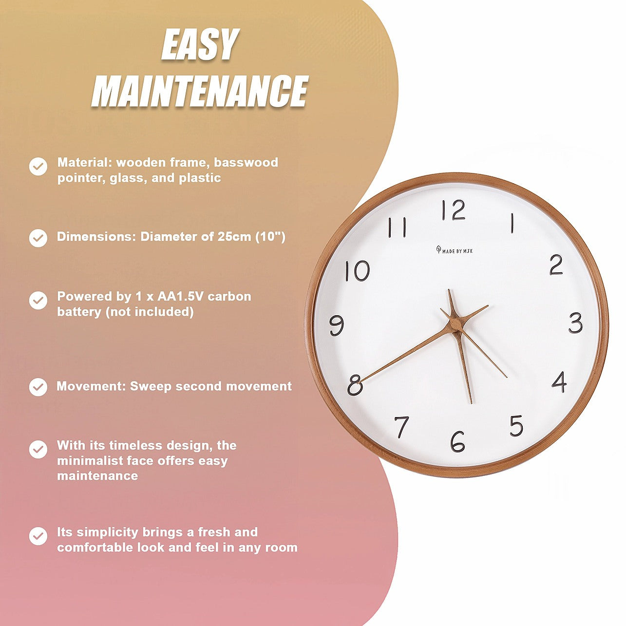 Driven by a battery-powered mechanism, this clock ensures unwavering functionality during power outages or electrical disruptions. Encased in natural solid wood, its simplicity brings a fresh and comfortable look and feel in any room. This clock effortlessly complements any room within a household, or even in an office, adding an attractive accent that contributes to the visual allure of its surroundings.