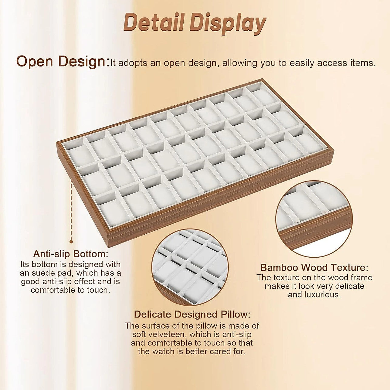 Keep your collection of watches and jewellery beautifully organised and easy to access with this 30-Grid Display Tray Organiser. Designed for both men and women, this stylish and durable display case is made from quality composite board with a smooth, rustic finish that adds a touch of elegance to any space. The anti-friction velvet fabric is soft to protect your valuables from scratches.