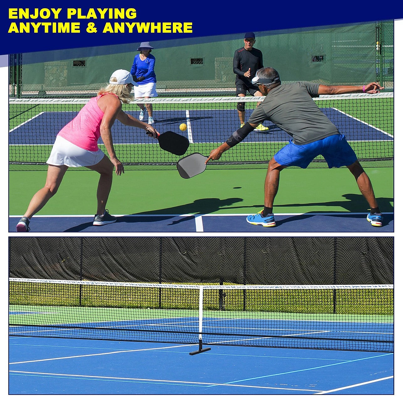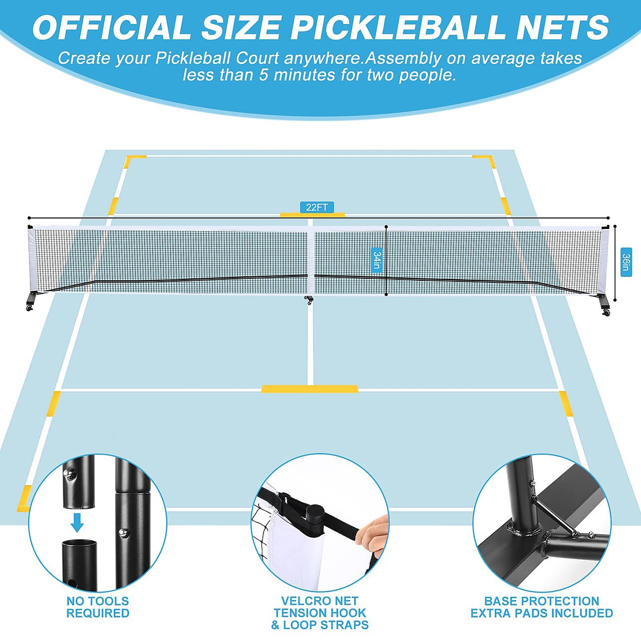 With a full-size court marking kit included, you can set up an official-sized court anywhere – from your driveway to the backyard. The numbered and marked metal tubes with locking pins allow for quick assembly in minutes, and the tear-resistant PE net with 600D PVC sleeves ensures long-lasting use.