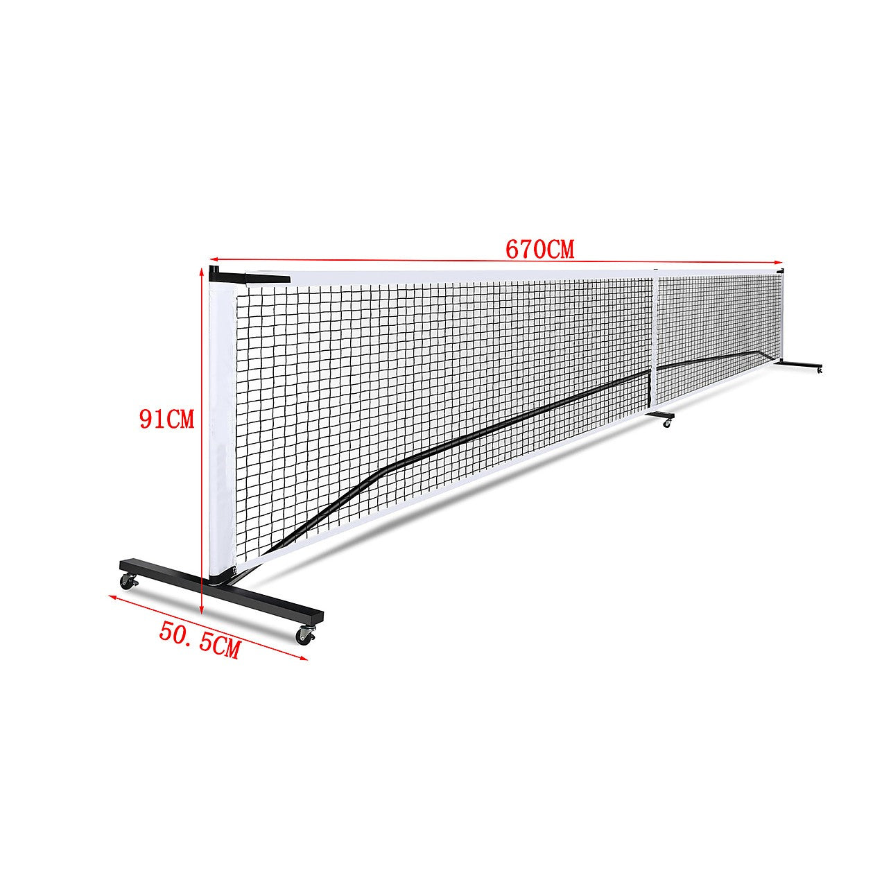 - Full-Size Net – 6.7m wide, 91cm high on sides, 86cm in the middle for regulation play