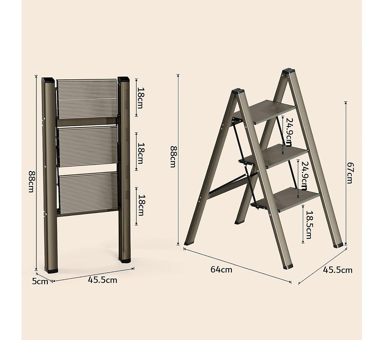 Crafted from high-quality aluminium with a stable triangular frame, this foldable step ladder supports up to 150kg while remaining lightweight and easy to carry. The wide, textured anti-slip pedals and rubber feet ensure secure footing, while its slim foldable design makes storage effortless in cupboards, garages, or behind doors.