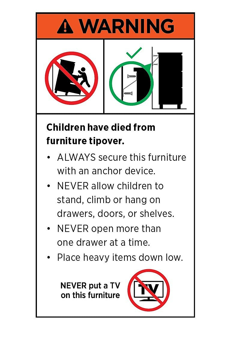 - NEVER allow children to stand, climb, or hang on drawers, doors, or shelves.