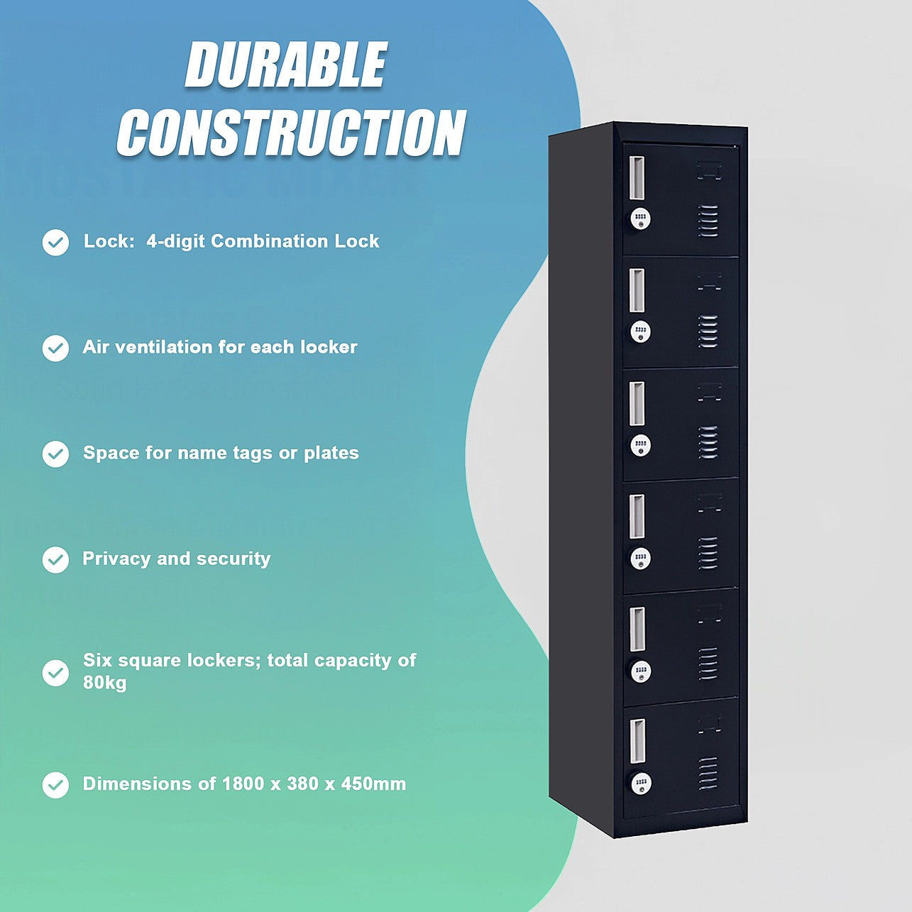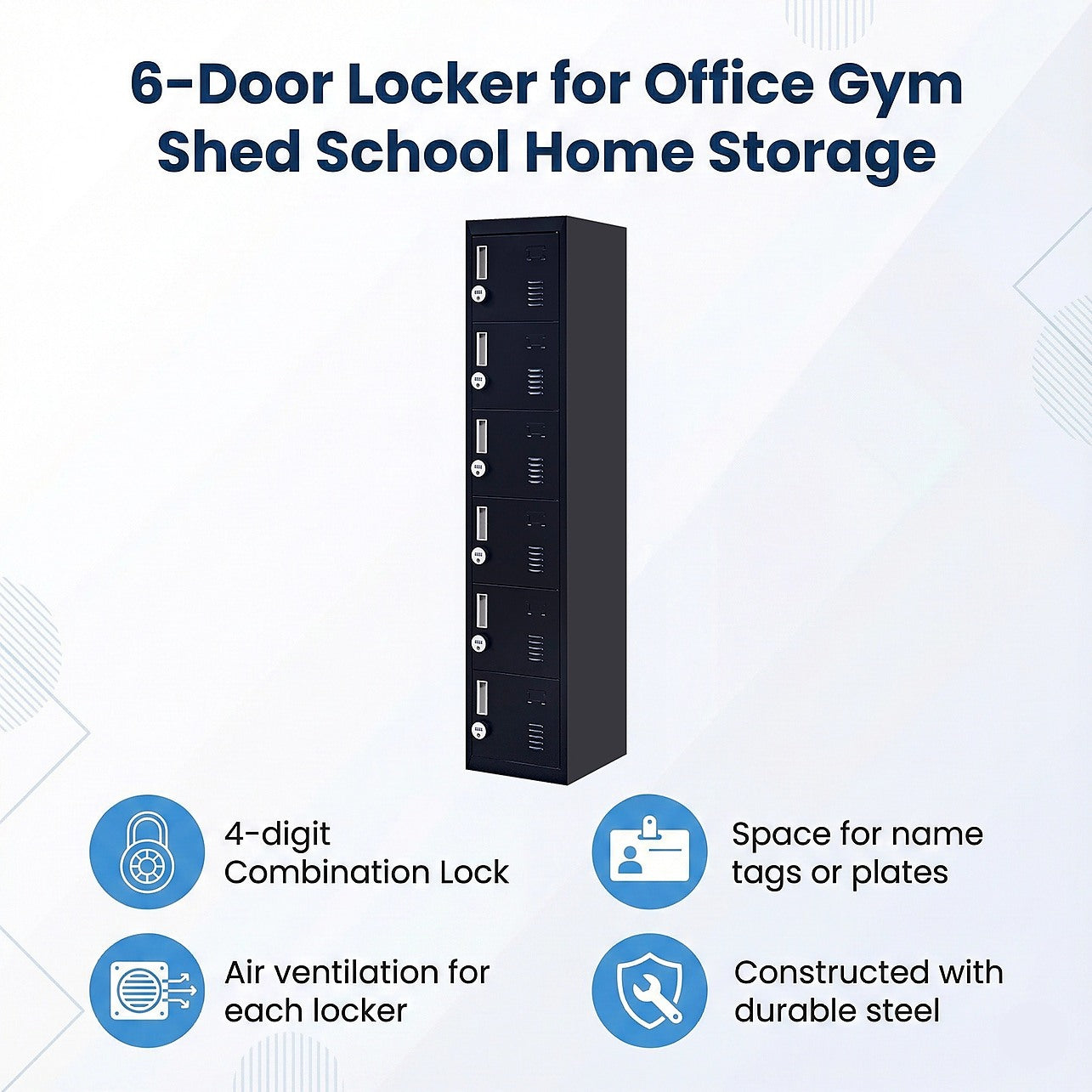6-Door Black Metal Locker Cabinet – Vertical Storage with 4-Digit Combination Lock for Office, School