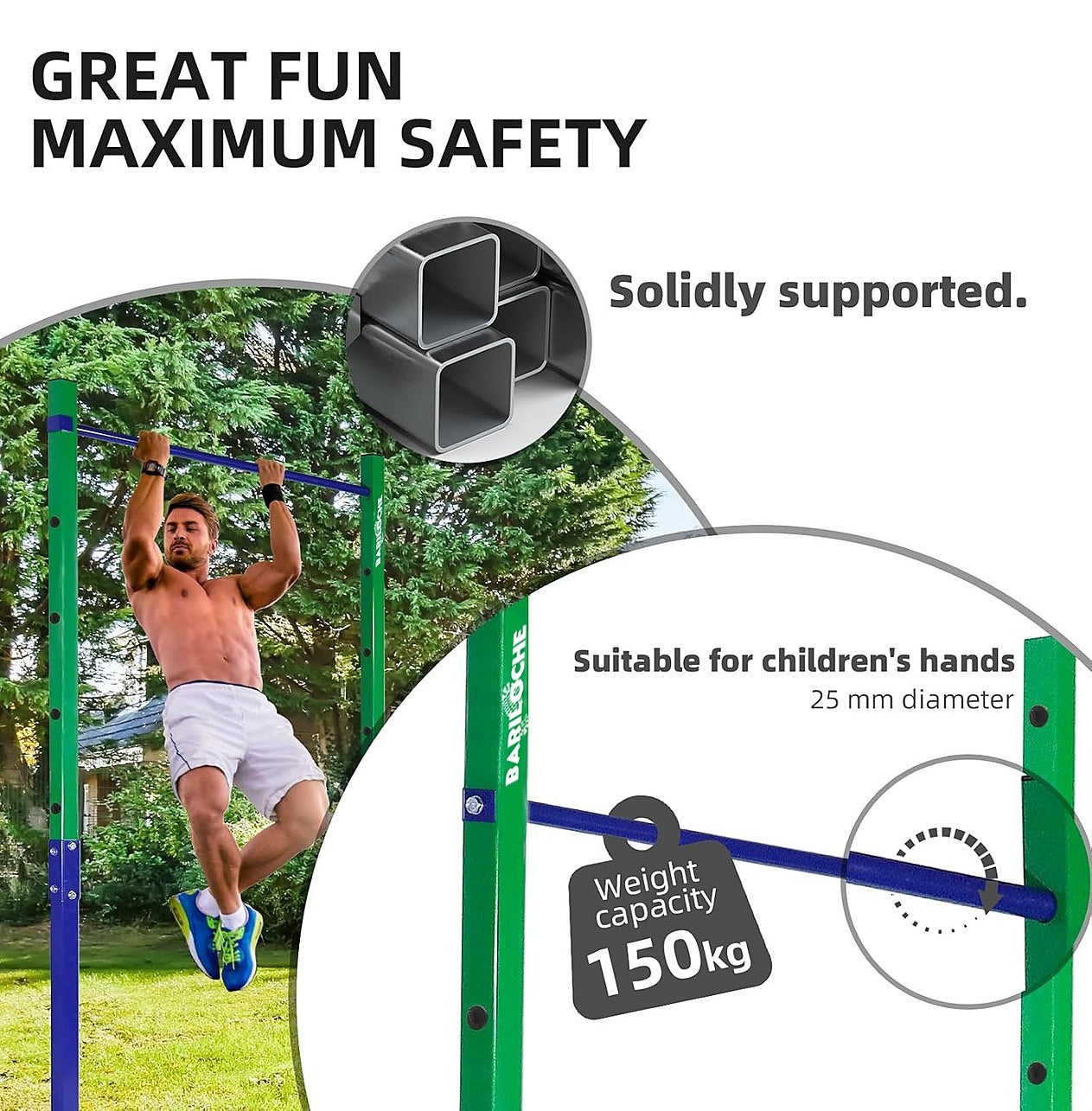 Designed for both fitness and fun, this Outdoor Pull-Up Bar is perfect for gymnastics, strength training, and active play. Featuring 5 pre-drilled height settings, the bar can be freely adjusted between 80 cm and 180 cm, making it ideal for users of all ages and skill levels. For maximum stability, 50 cm of the frame must be securely buried into the ground.