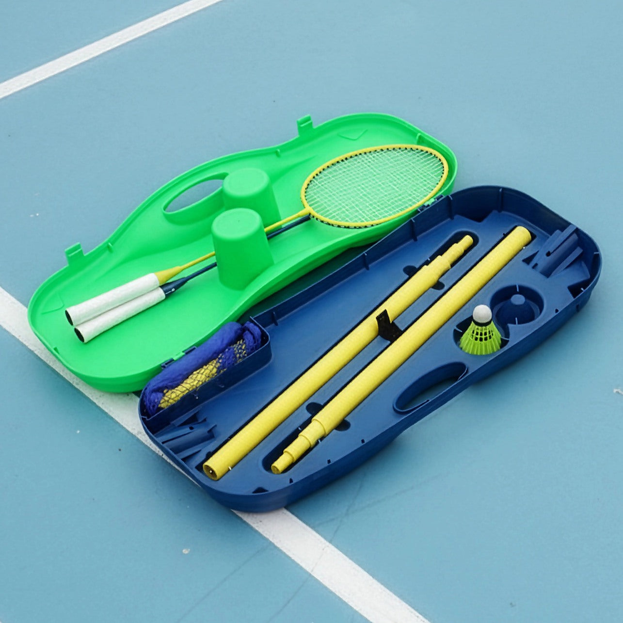 - Contents: Net, 2 telescoping support bars, a fillable base, a set of badminton rackets, and a case.