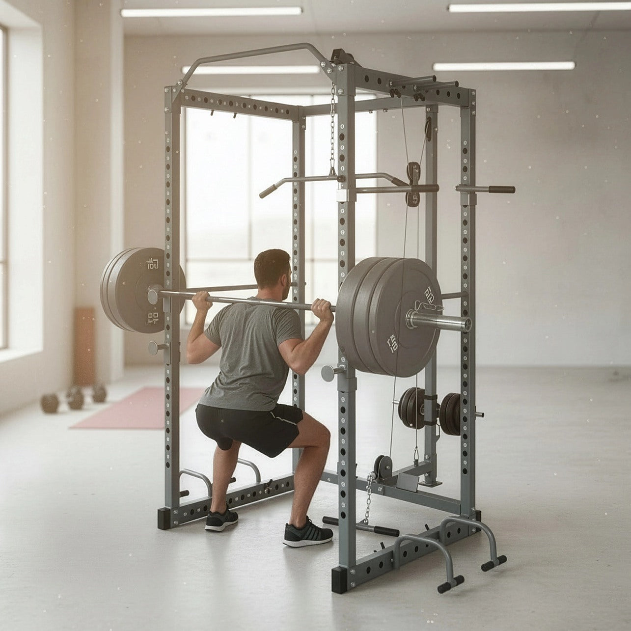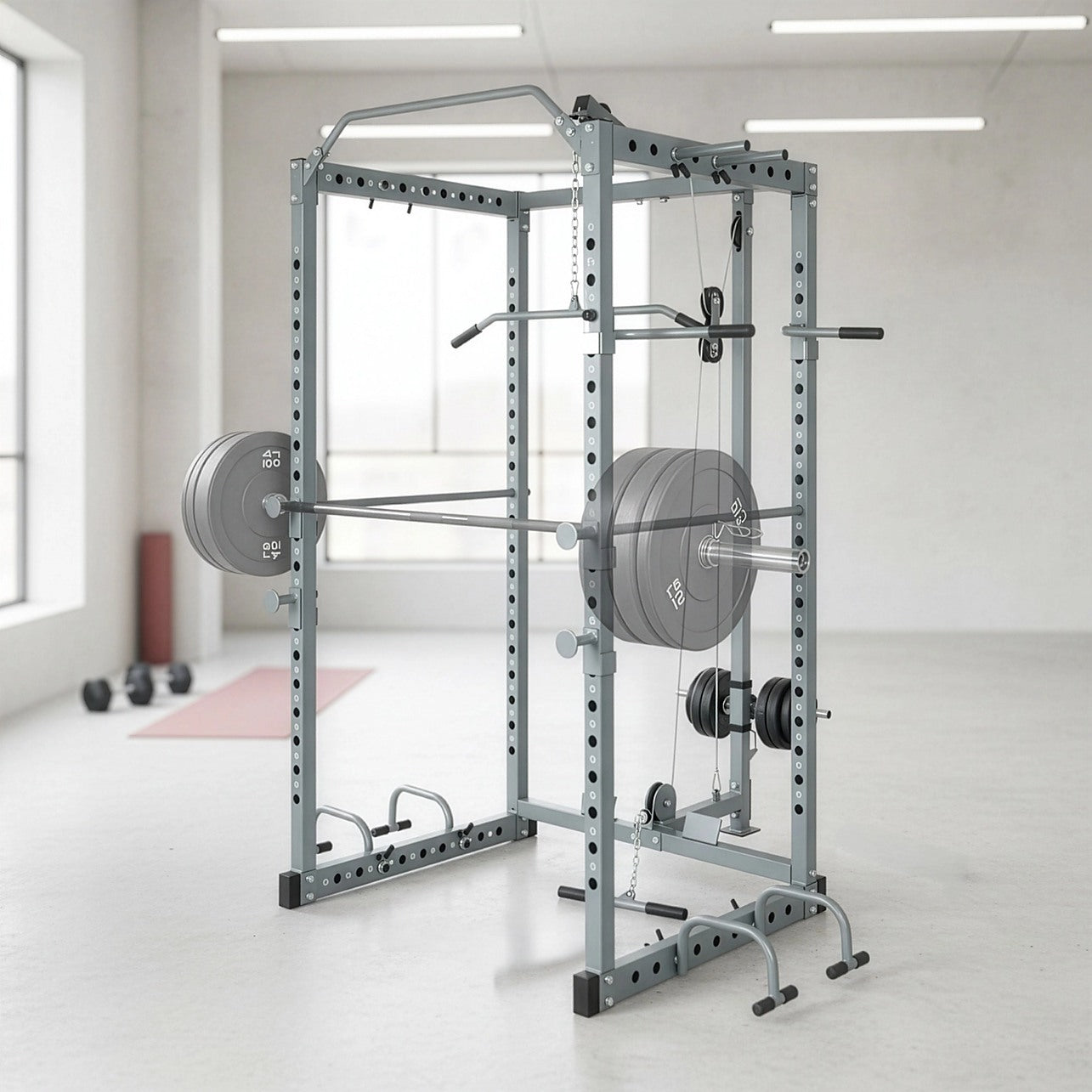 Home Gym Power Rack Squat Cage – Heavy-Duty Fitness Stand with Lat Pulldown Attachment
