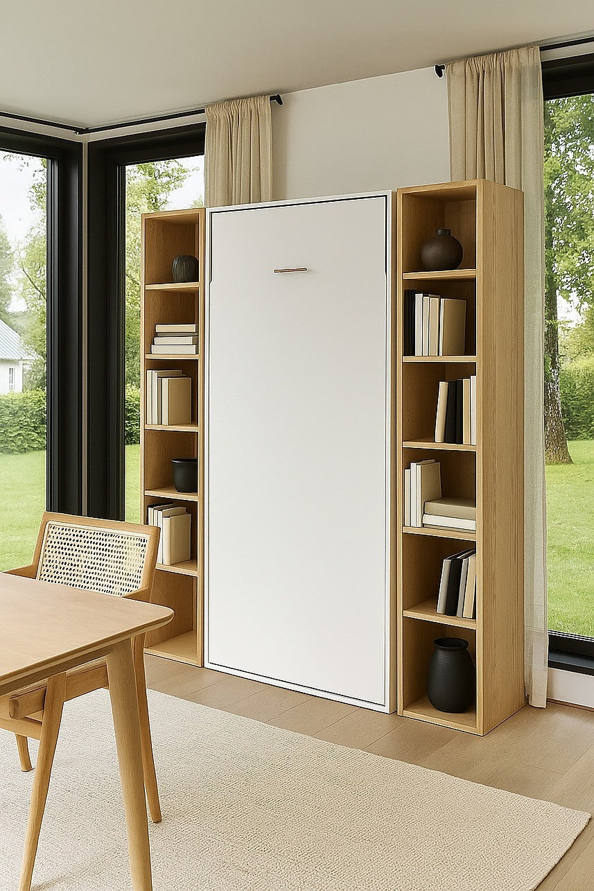 Designed for custom builds, this Murphy bed kit is perfect for turning your spare room, home office, or studio into a multi-purpose space. The durable steel frame with powder-coated finish ensures long-lasting strength, while pneumatic pistons make lifting easy. Features include high-quality slats, automatic folding legs, and a slow-fall safety system for secure use. The included sleek metal door handle adds a premium touch to your cabinetry.