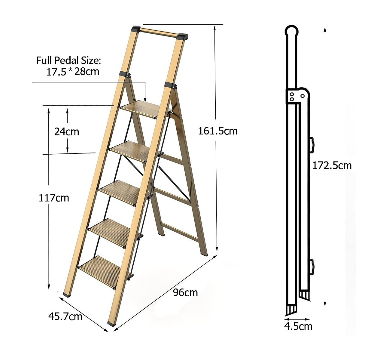 With a compact foldable design, you can store it easily in cupboards, garages, or under furniture when not in use. Fully assembled and ready to use, this 5 step folding ladder is perfect for kitchens, bedrooms, libraries, classrooms, garages, or even as a decorative ladder for books and plants.