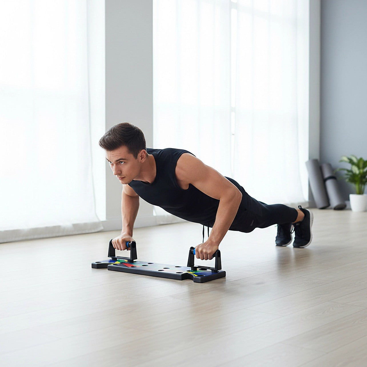 Whether you're a weekend warrior or a serious athlete, you need to add this nine-in-one push-up board by Randy & Travis Machinery to your home gym. Small and easy to store, it provides a wealth of workouts in a single piece of equipment. Along with the board, tension bands with easy-grip silicone handles make it easy to customise your workout for the muscle group you want to work. A complimentary fitness program – created by professional coaches – provides you with a training schedule that can take you from beginner to perfectly fit in a step-by-step regimen.