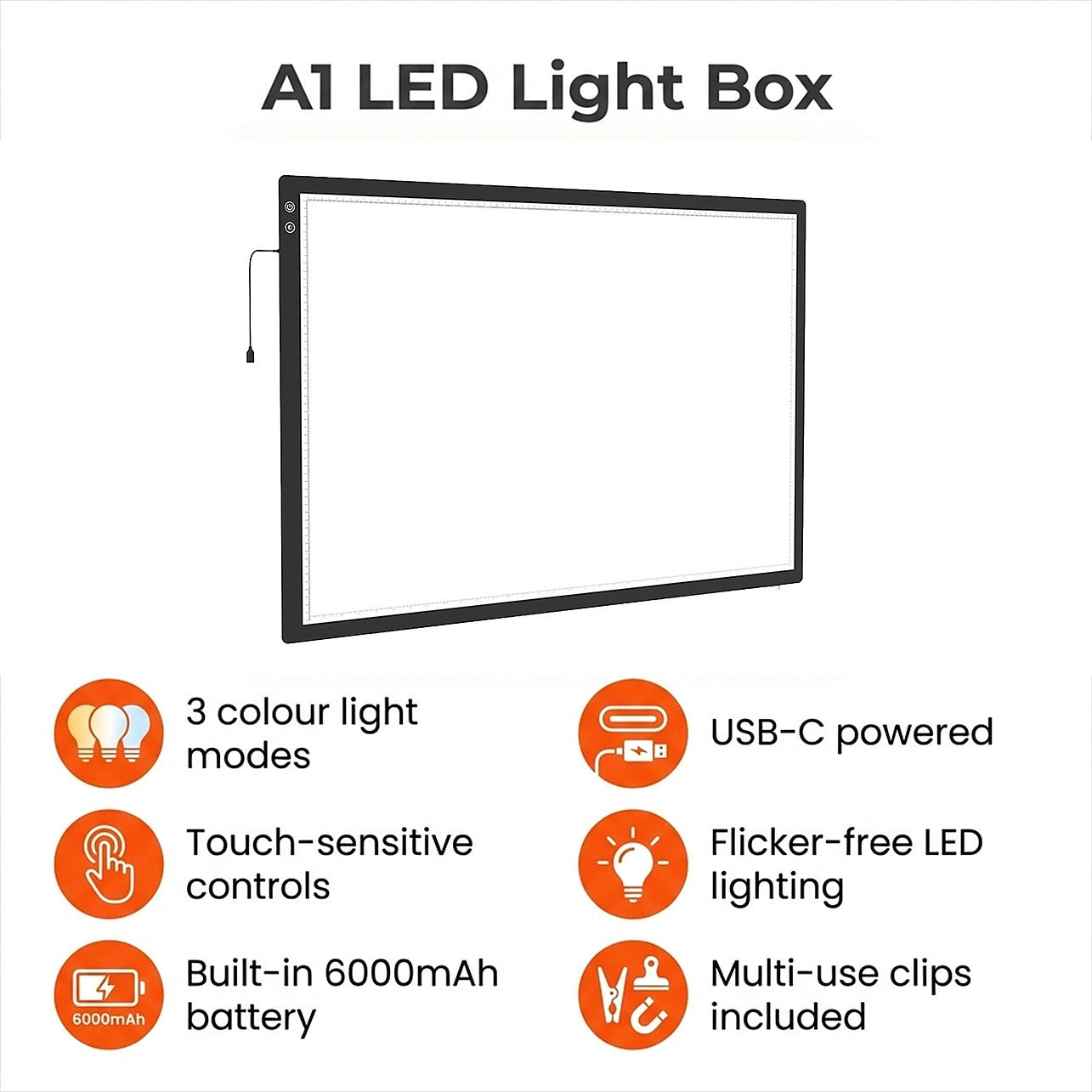 Upgrade your creative workflow with this versatile A1 LED Light Box, designed for artists, crafters, designers, and hobbyists. Featuring three colour temperatures—warm, natural, and white light—this tracing light board adapts to any environment, helping reduce eye strain during long creative sessions.