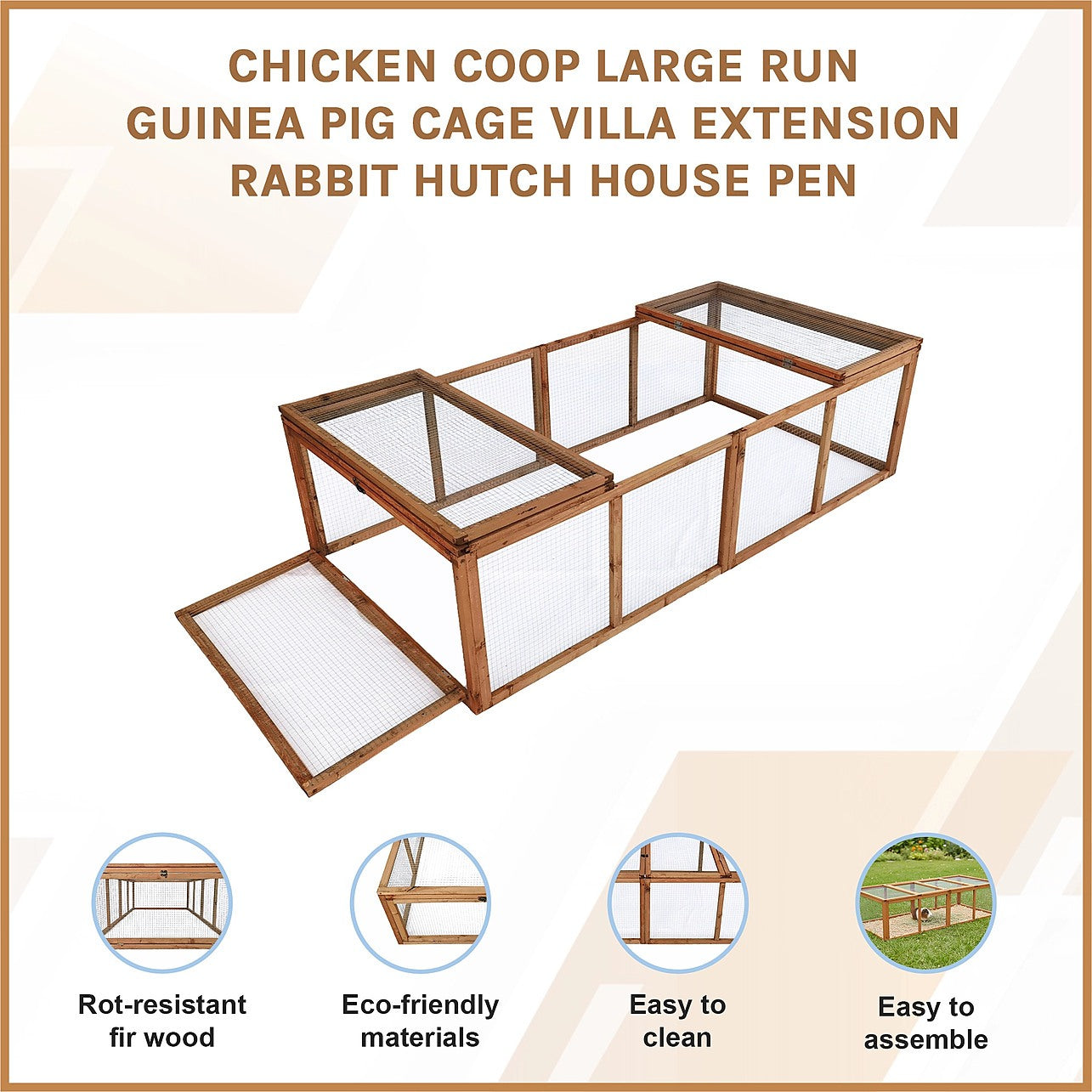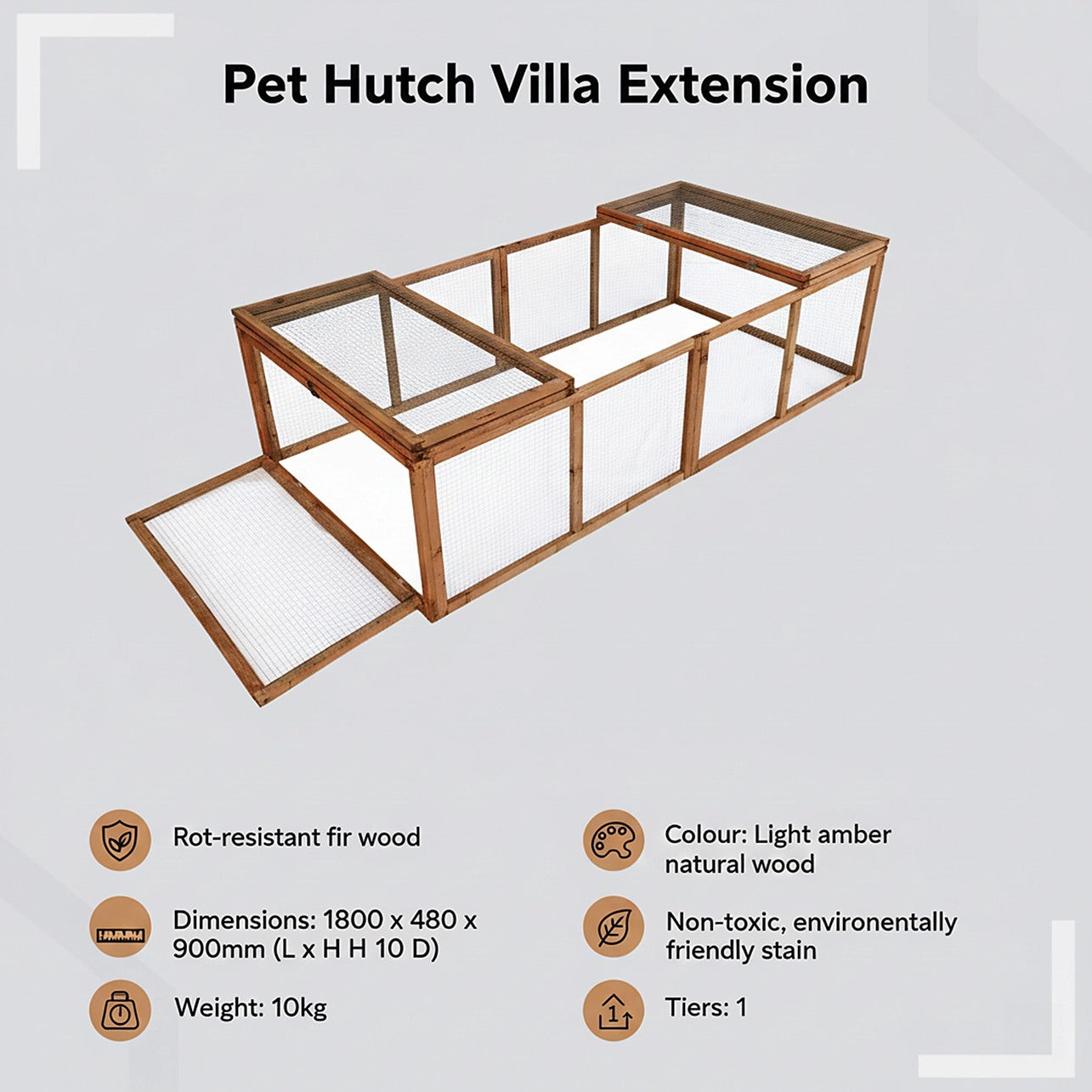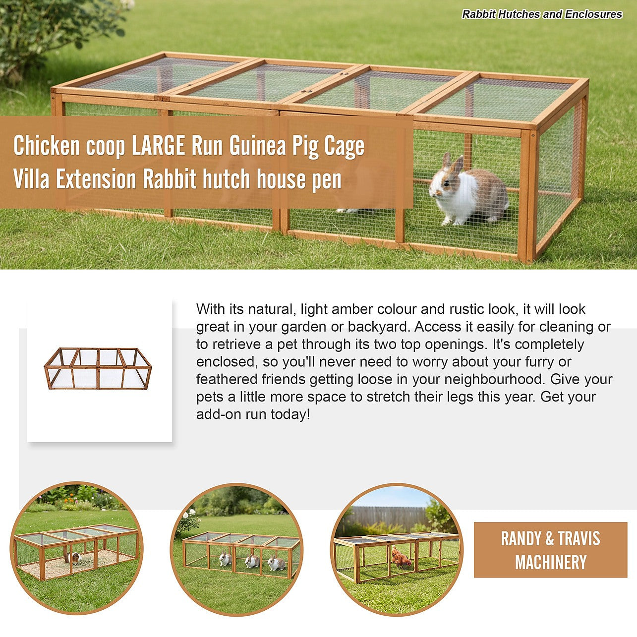 With its natural, light amber colour and rustic look, it will look great in your garden or backyard. Access it easily for cleaning or to retrieve a pet through its two top openings. It's completely enclosed, so you'll never need to worry about your furry or feathered friends getting loose in your neighbourhood. Give your pets a little more space to stretch their legs this year. Get your add-on run today!