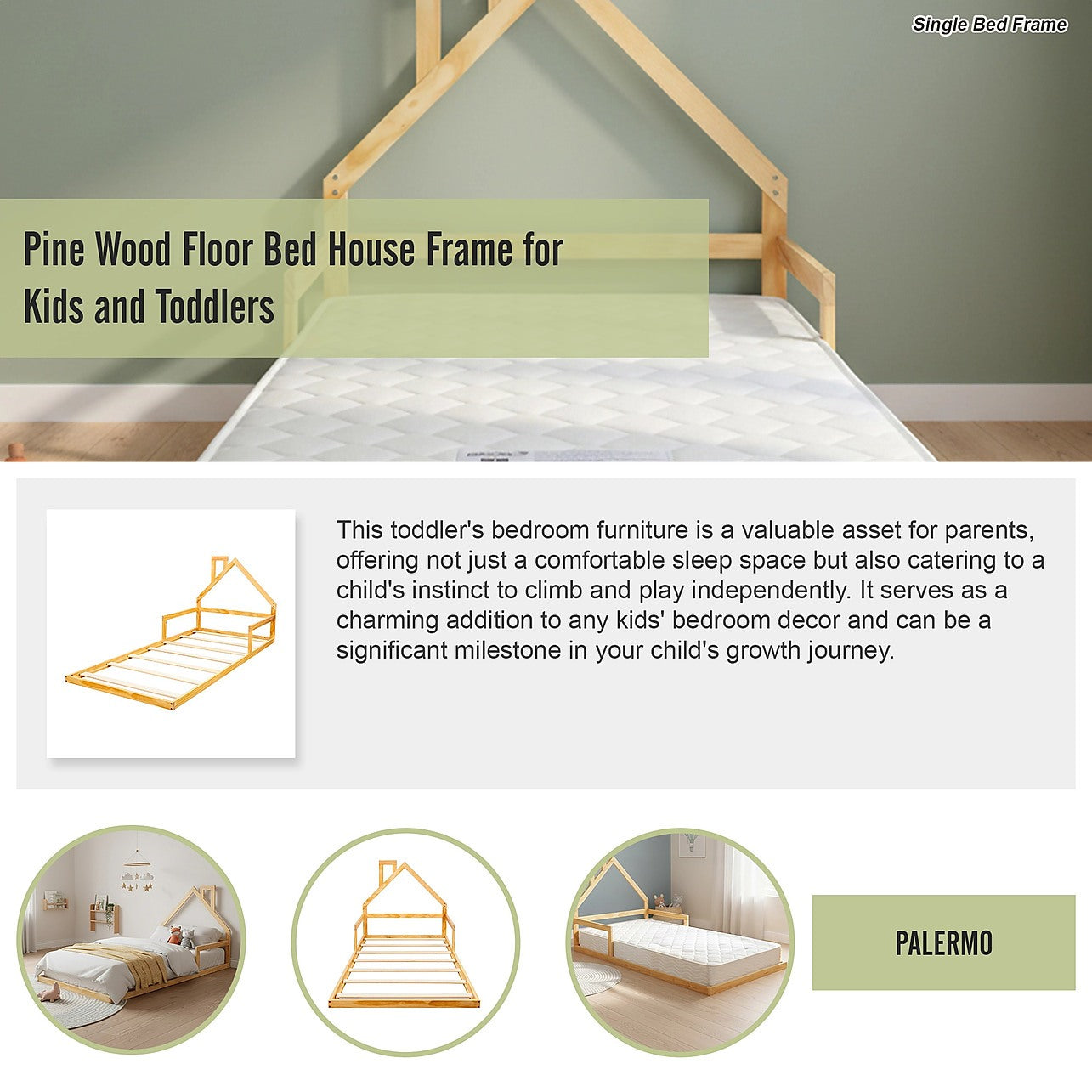 Create a safe and stylish sleep space with this Palermo low bed for kids, crafted from high-quality pine wood. Designed with little ones in mind, its floor-level height encourages independence while minimizing the risk of falls. The natural pine finish brings warmth to any room and can be easily customised to match your child's space or your aesthetic vision.